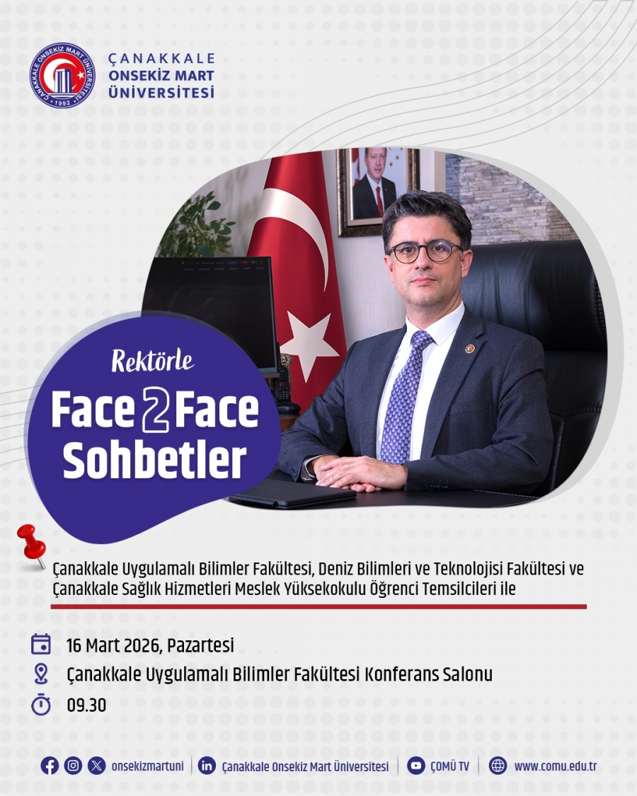 Çanakkale Uygulamalı Bilimler Fakültesi, Deniz Bilimleri ve Teknolojisi Fakültesi ve Çanakkale Sağlık Hizmetleri Meslek Yüksekokulu öğrenci temsilcilerinin katılımıyla gerçekleştirilecek "Rektörle Face 2 Face Sohbetler" etkinliği, 16 Mart 2026 Pazartesi günü saat 09:30'da Çanakkale Uygulamalı Bilimler Fakültesi Konferans Salonu'nda yapılacaktır.