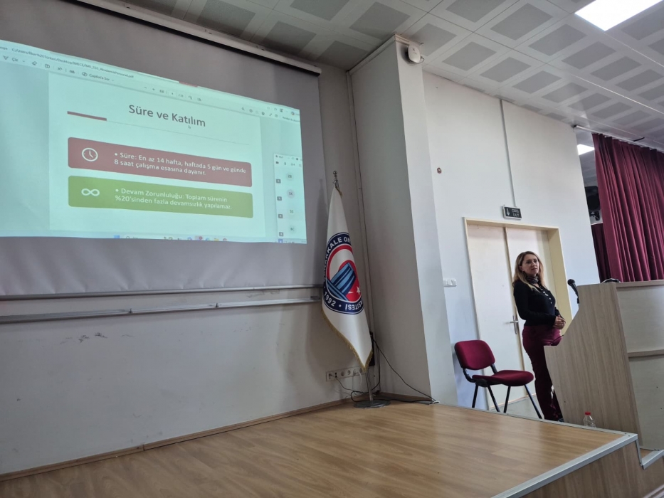 26 Kasım 2025 tarihinde saat 13.00’te amfide, Çanakkale Onsekiz Mart Üniversitesi İşletmede Mesleki Eğitim Koordinatörlüğü tarafından İşletmede Mesleki Eğitim Bilgilendirme Toplantısı düzenlendi. Toplantıya konuşmacı olarak İşletmede Mesleki Eğitim Koordinatör Yardımcısı Öğr. Gör. Nur ÖZDELİBAŞ katıldı.
